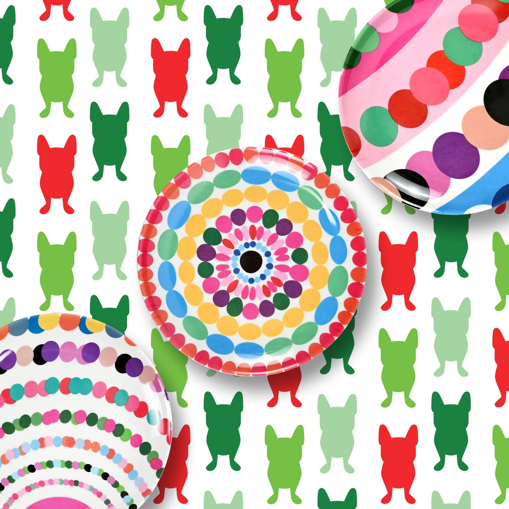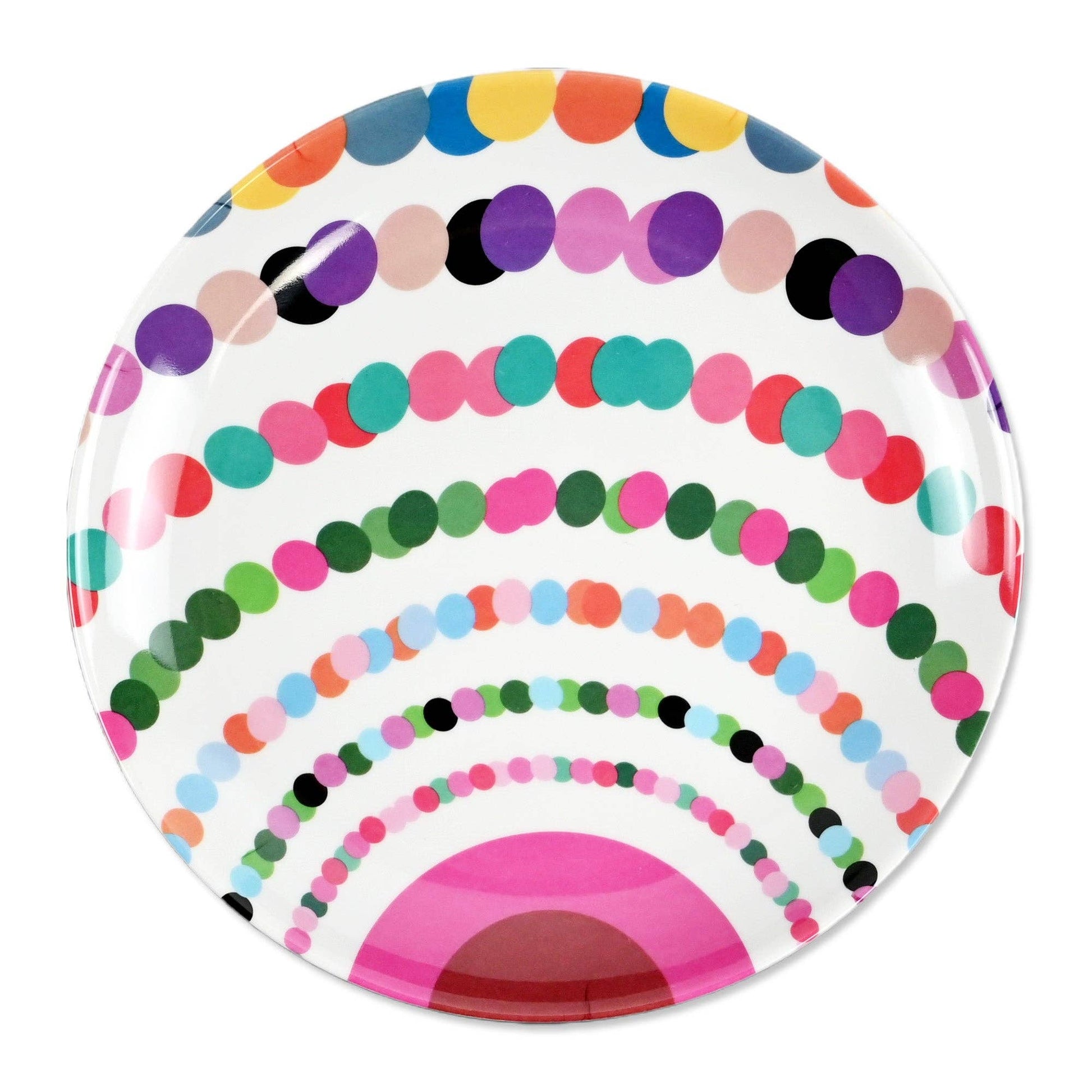 Our 6 piece plate set is great for tidbits, finger foods, desserts and appetizers. Each plate is a unique stripe and the set comes beautifully packaged in a gift box. Dishwasher safe, hand wash recommended. Do not use in the microwave. * Measurements: 6" Diameter; Set of 6. * Premium glazed melamine plate is scratch and shatter resistant, non-absorbent, and BPA-free.