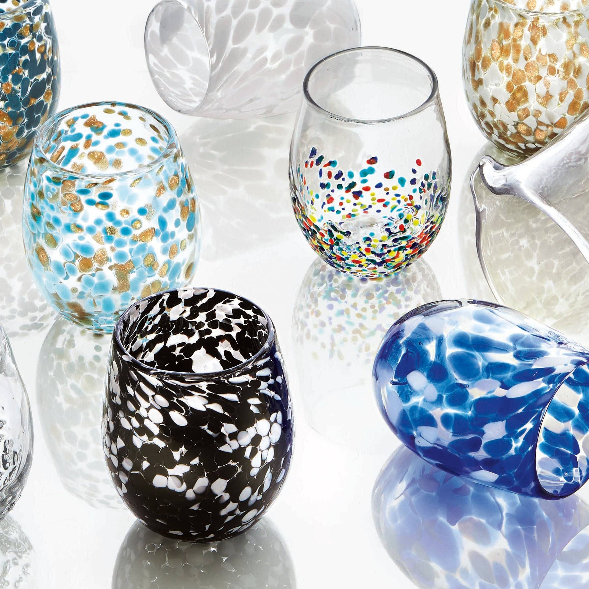 Each confetti stemless wine glass is mouth-blown and artisan made. Perfect for entertaining or eye-catching home decor. Lively color sprinkled throughout. Slight variations in color are to be expected—individual glasses are one-of-a-kind, no two pieces will be exactly alike. Mix and match with a range of glassware options from tag. Dishwasher safe, not recommended for use in microwave.