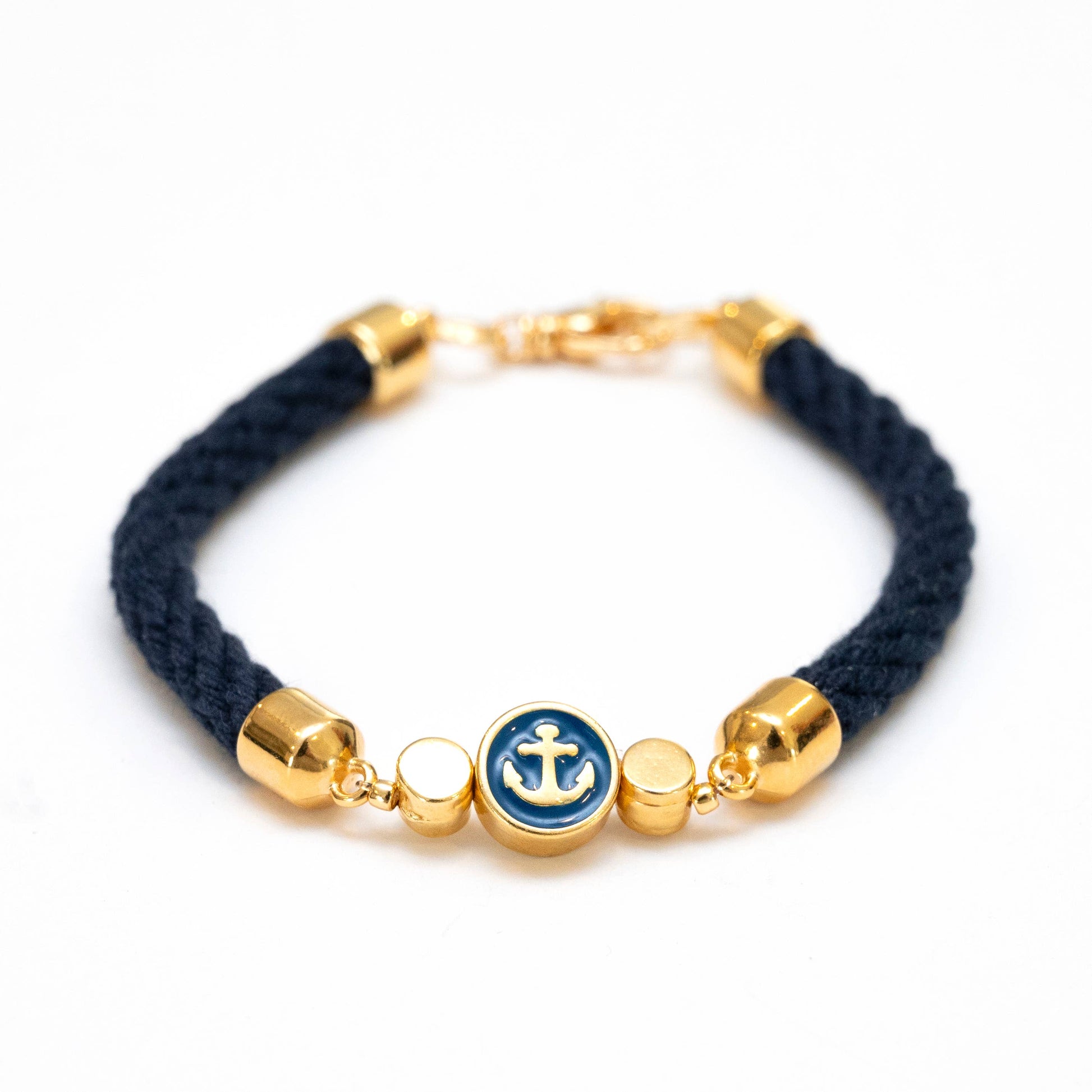 Natural cotton rope bracelet with enamel anchor bead and lobster clasp closure. Size: 7.5".