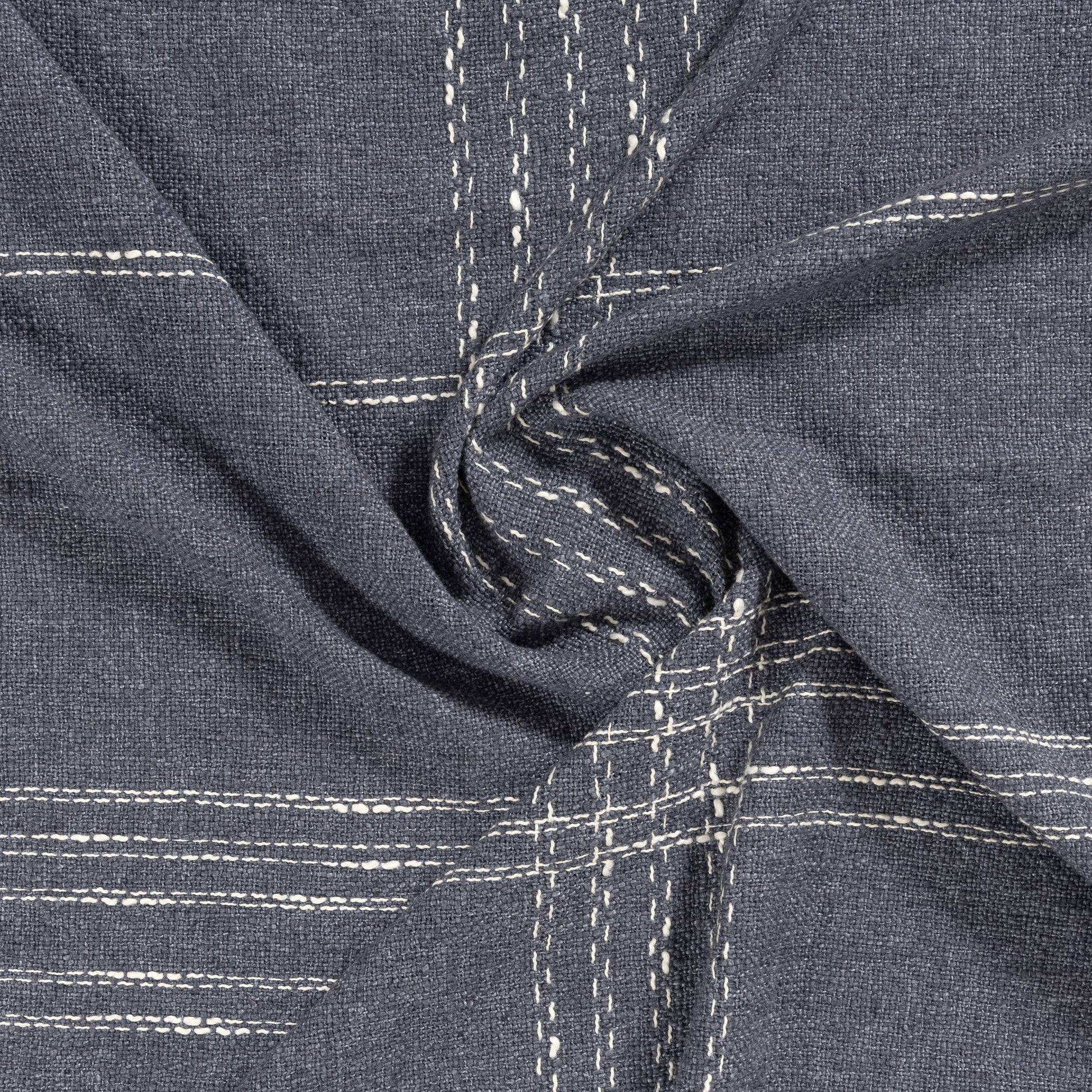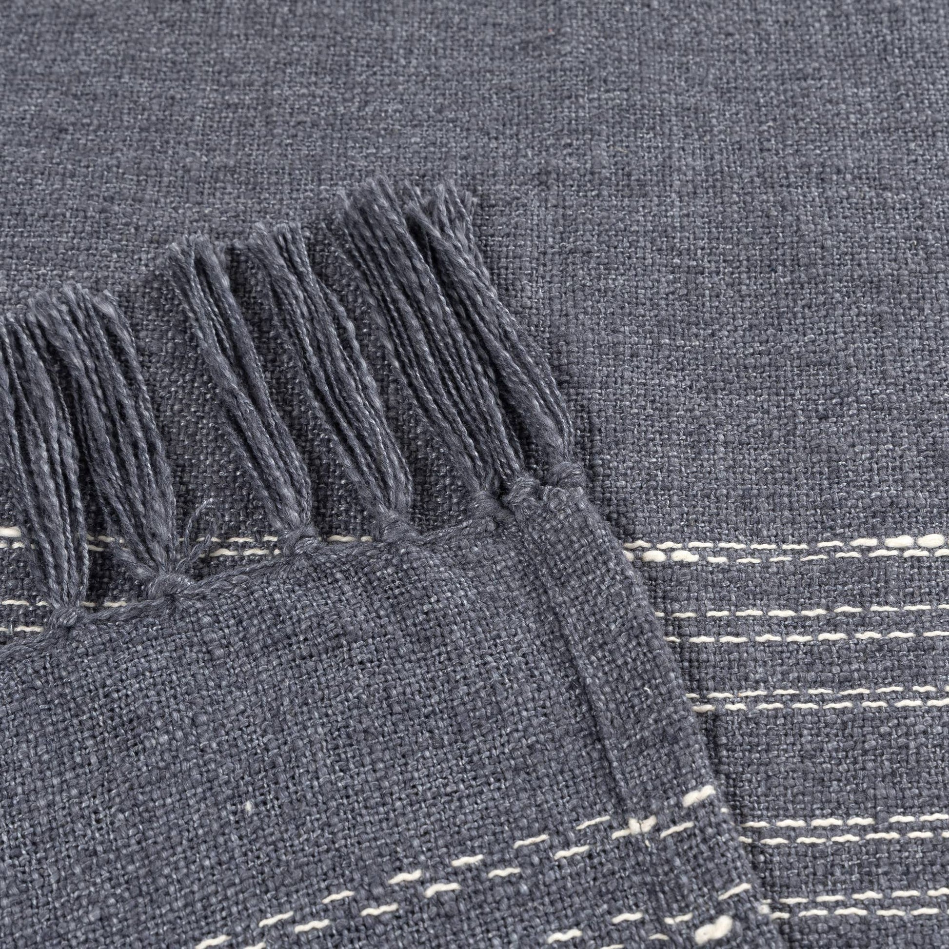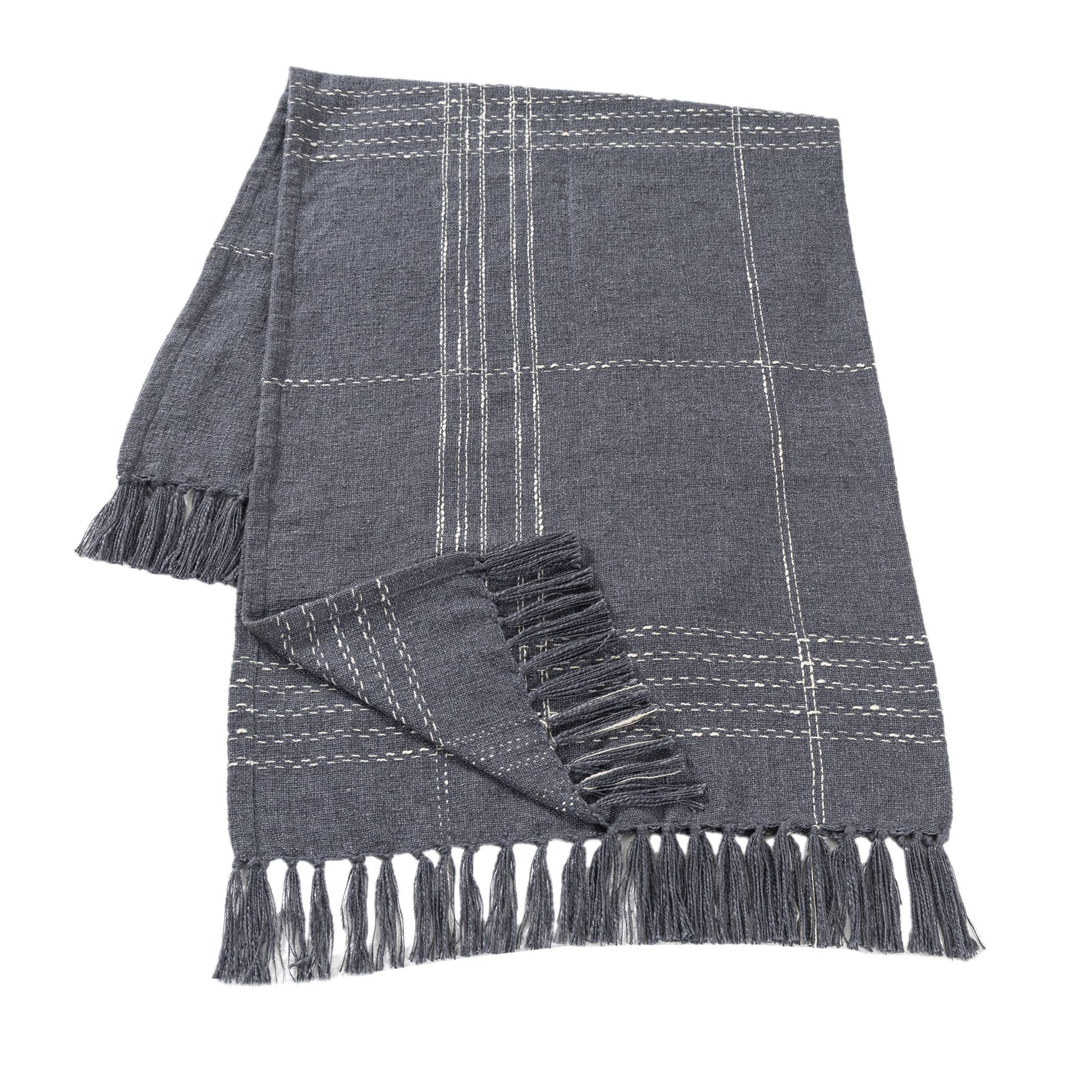 Cozy up with this blue and ivory hand-woven throw blanket, featuring a timeless checkered design. Crafted in India by skilled artisans, its cotton-polyester-linen blend offers soft durability and breathability. Fringe detailing adds a casual yet sophisticated touch, making it perfect for nautical, coastal, farmhouse, rustic, or transitional décor styles. This versatile throw enhances any space with comfort and style, whether draped over a sofa, bed, or chair. Fully machine washable, it maintains softness and vibrant color wash after wash for easy care and lasting comfort. Please note: Colors and patterns may vary due to monitor differences and handcrafted nature.