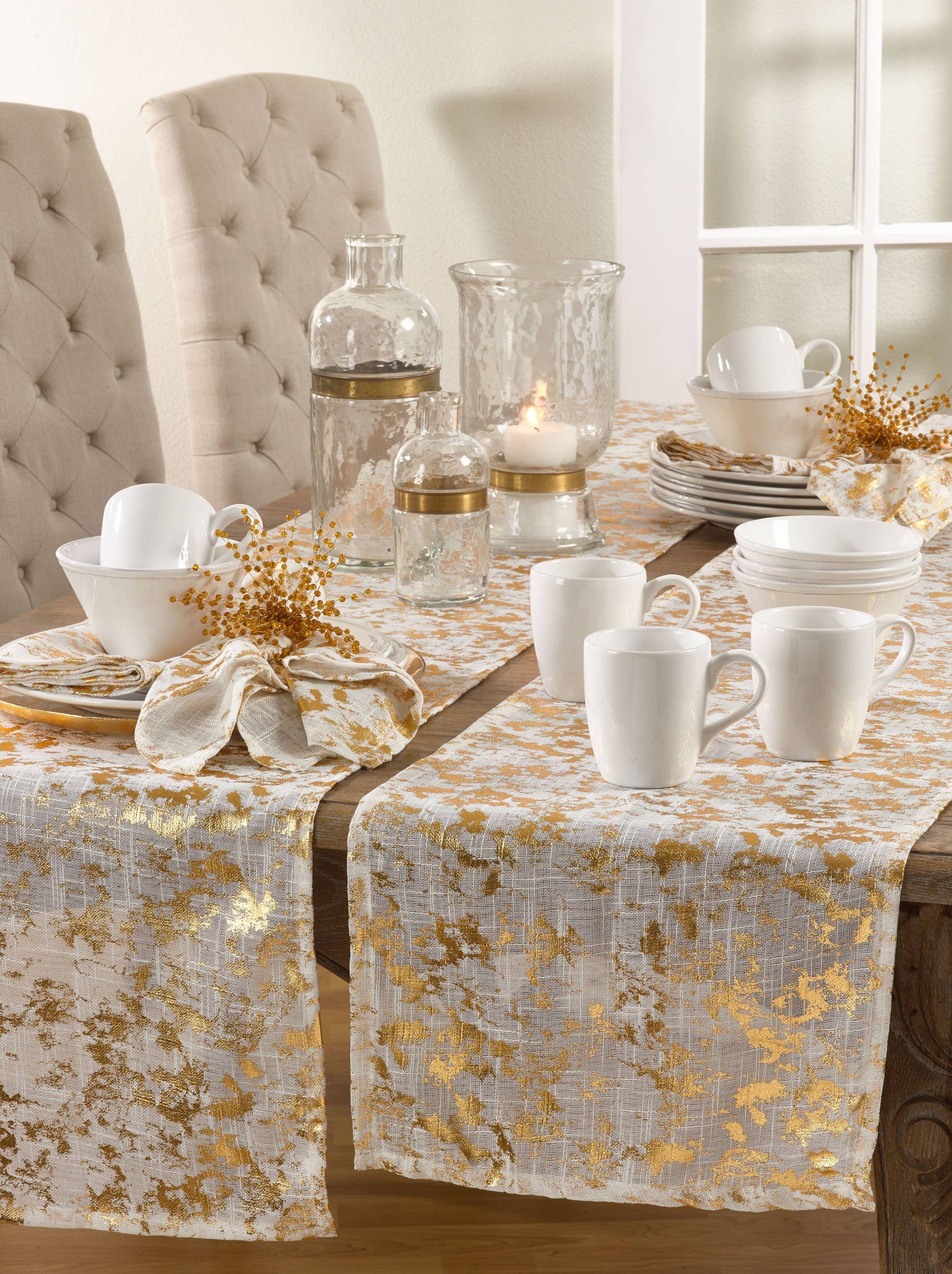 Turn any tablescape into something grand with this metallic print table runner. Boasting a gold foil print design all over, the table runner adds glitzy glam to any setting. Complement the runner with gold accents and chic dishware.