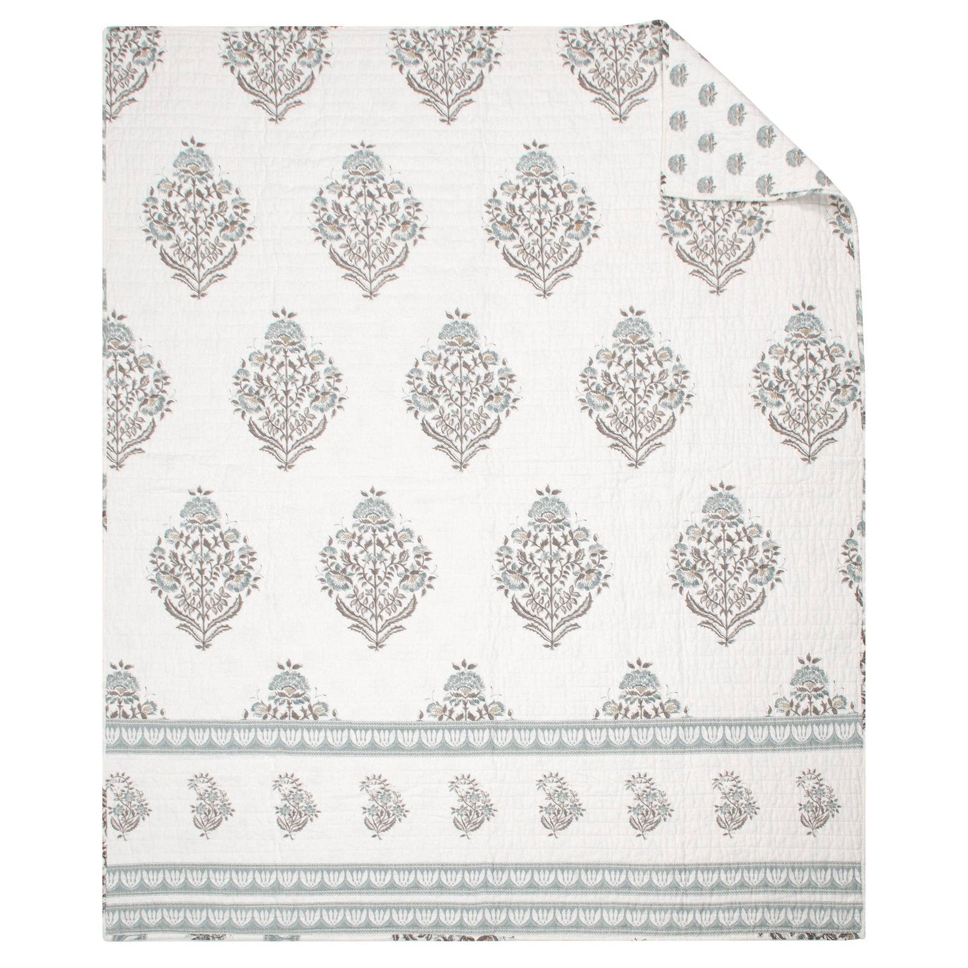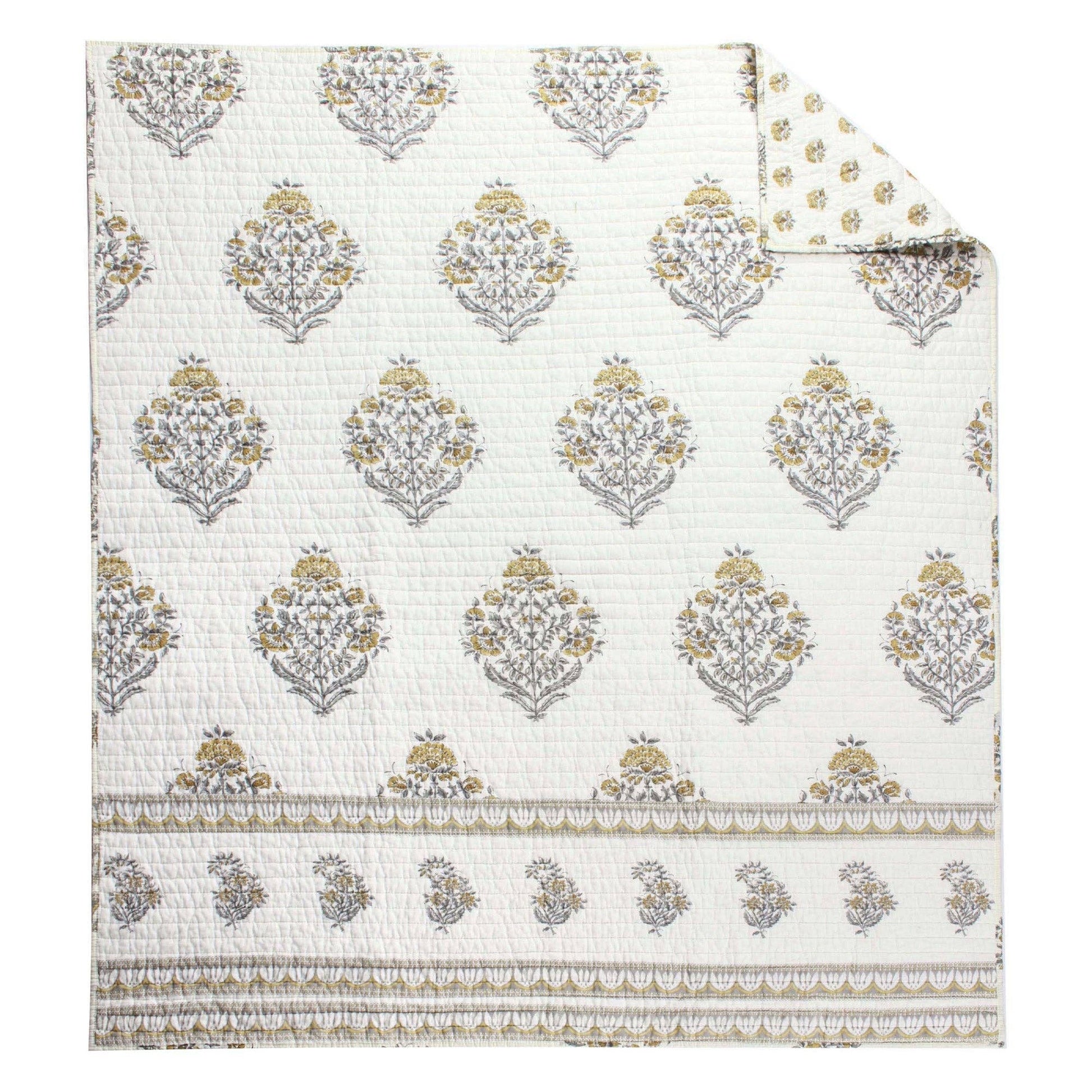 The Kamira Reversible Throw blanket by Levtex Home is inspired by summer country gardens. Offered in ochre and spa colors, this design will immediately transform any room. This throw features a unique flower bush with a distinctive bottom border on the front, reversing to a miniature flower bush on the back. The Throw (50x60in.) has a cotton front and back, filled with a cotton-rich filler, and is machine washable.