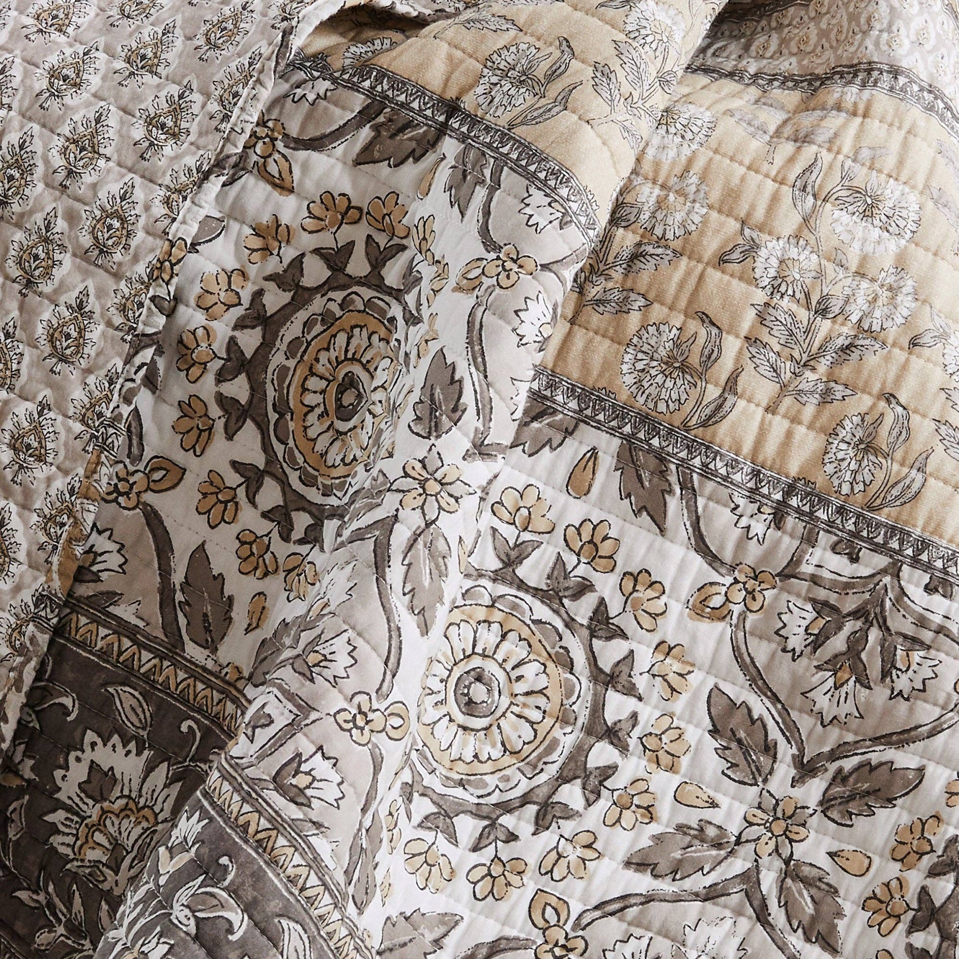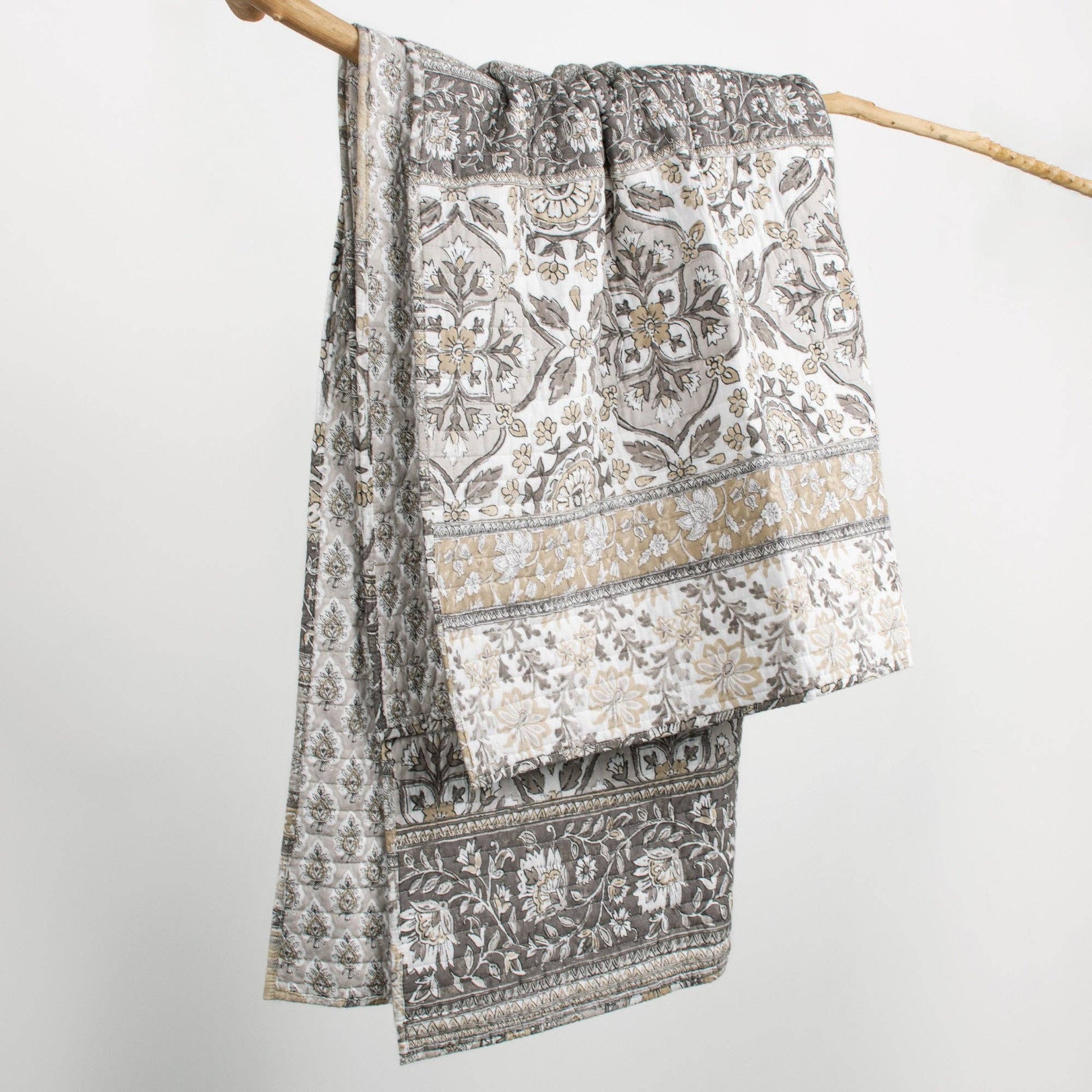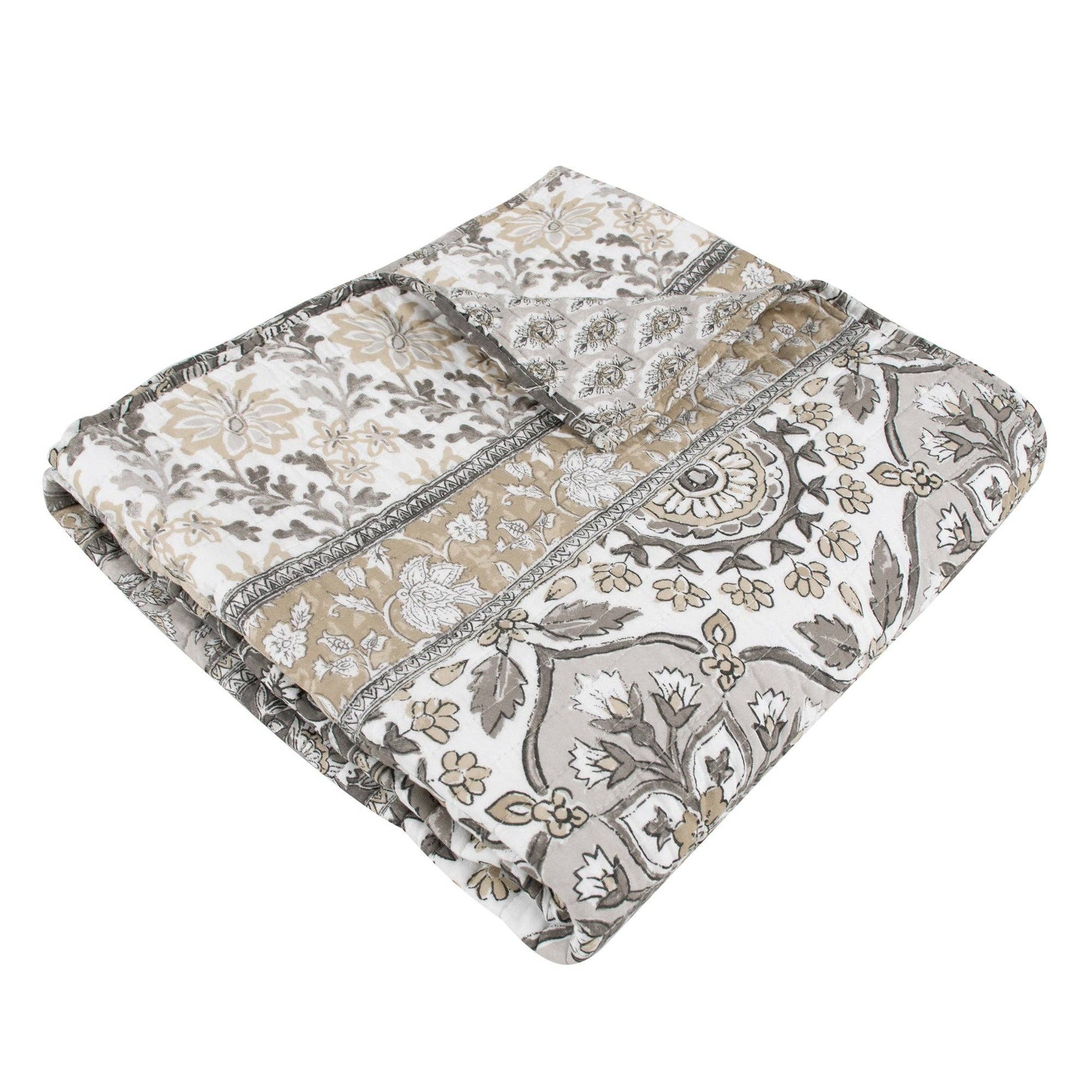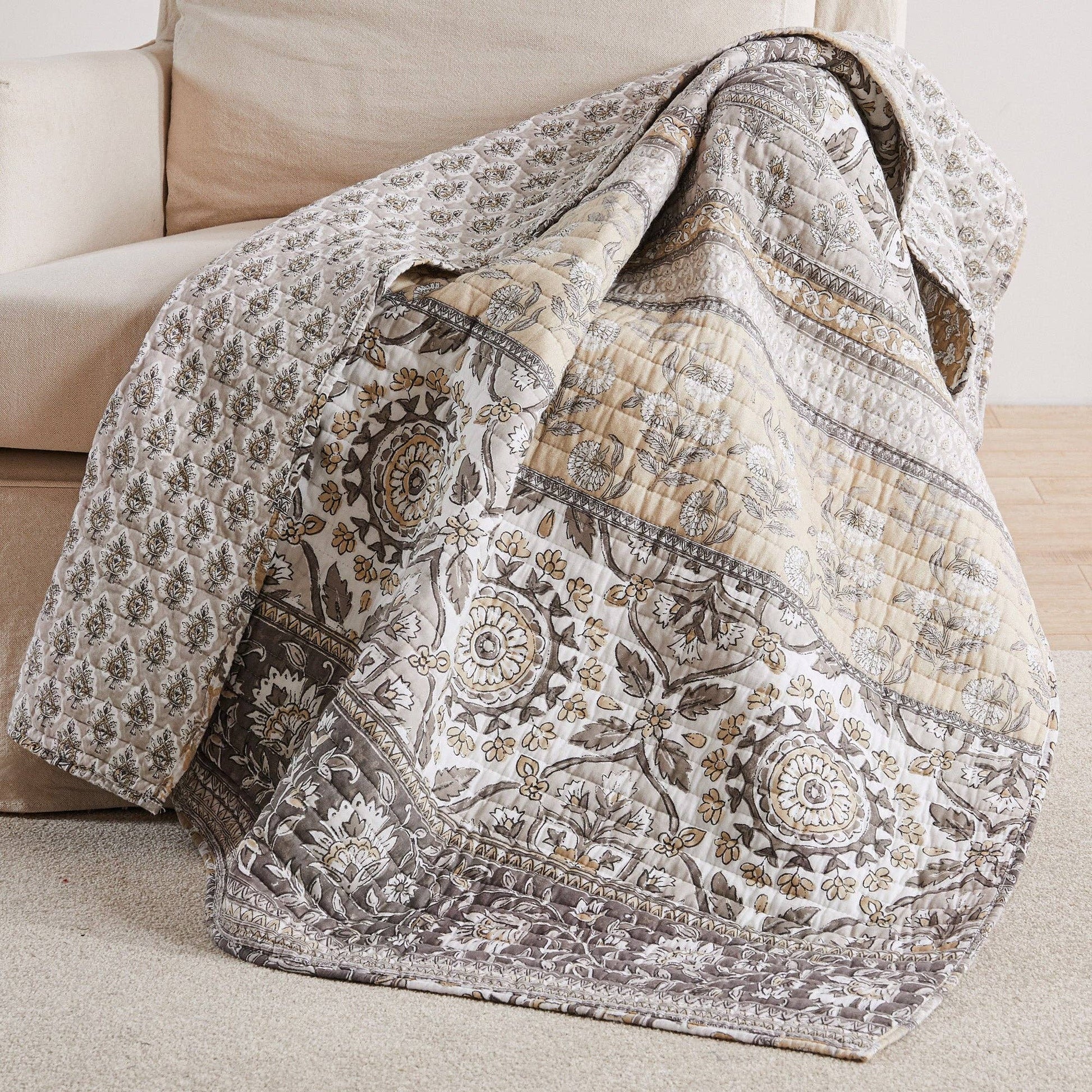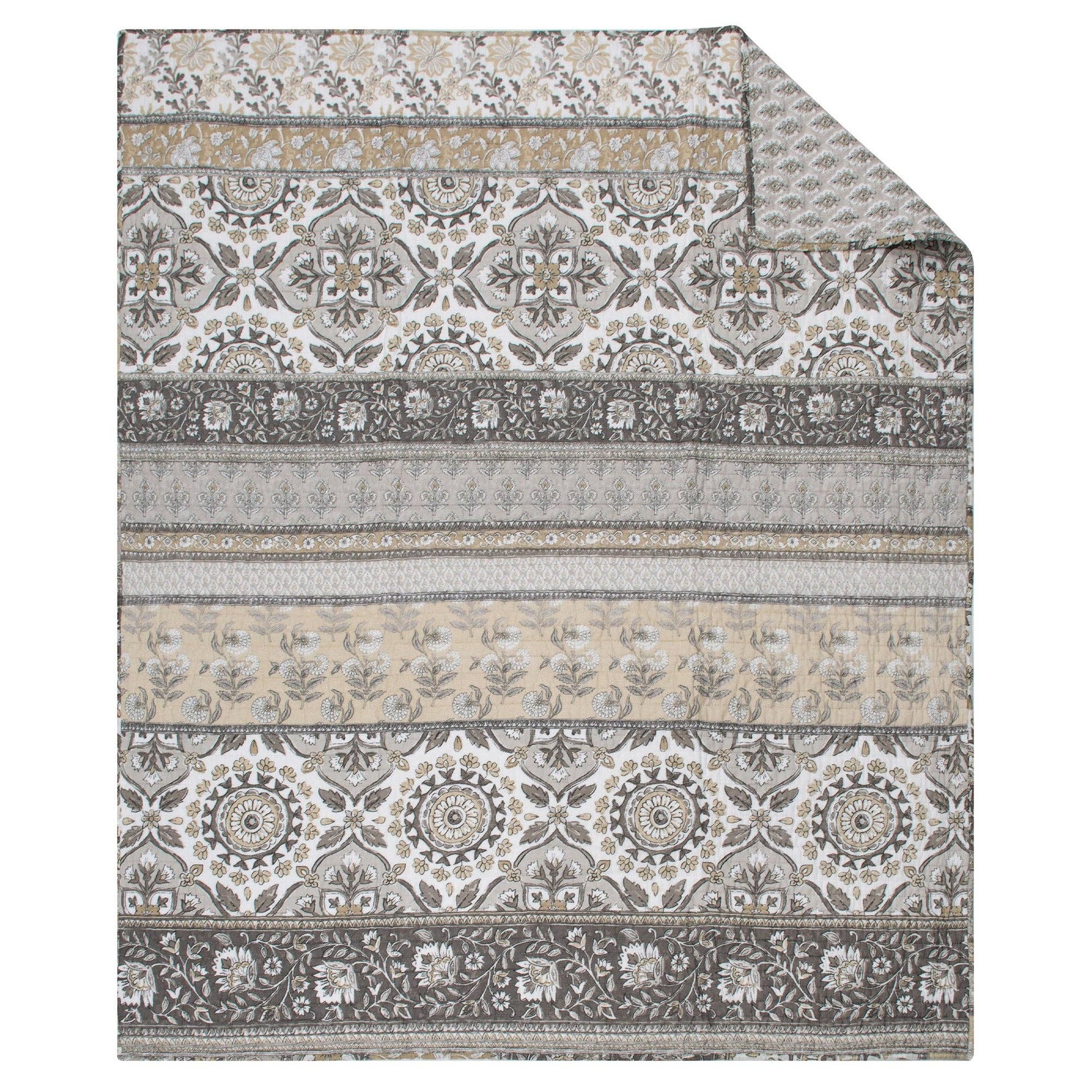 The Lirelle Reversible Throw blanket by Levtex Home is inspired by vintage textiles. Offered in grey, tan, white, and charcoal, this design will immediately transform any room in your home. This throw features intricate floral patterns and geometric designs on the front, reversing to small leaf motifs in charcoal and white on a grey ground. on the back. The Throw (50x60in.) has a cotton front and back, filled with a cotton-rich filler, and is machine washable. Enjoy this for years to come!