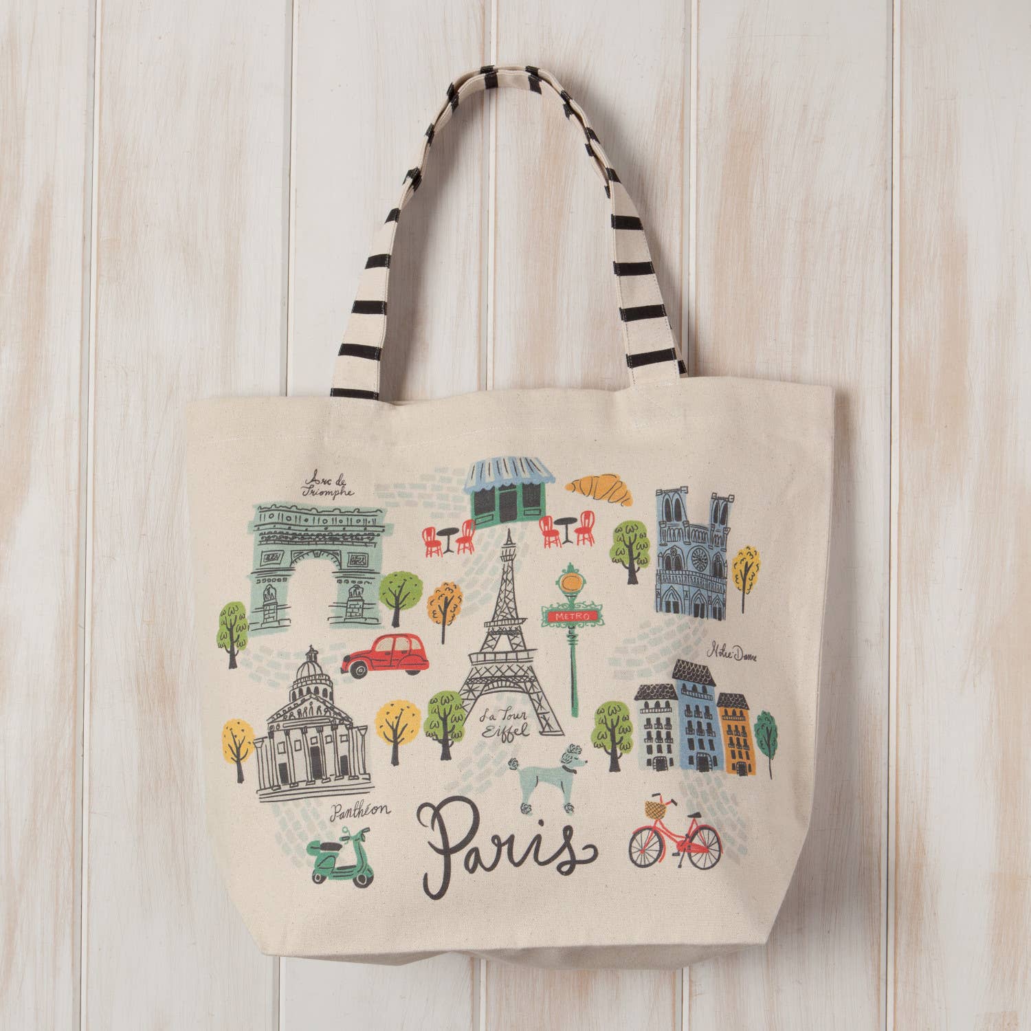 Generous cotton tote bags pack a lot of personality and more. Treasures from the farmer's market, library, or store fit with ease. The reinforced stitching and flat bottom allow for easy packing, and long handles make carrying a breeze. Celebrate community and show love for our local businesses with this charismatic collection.