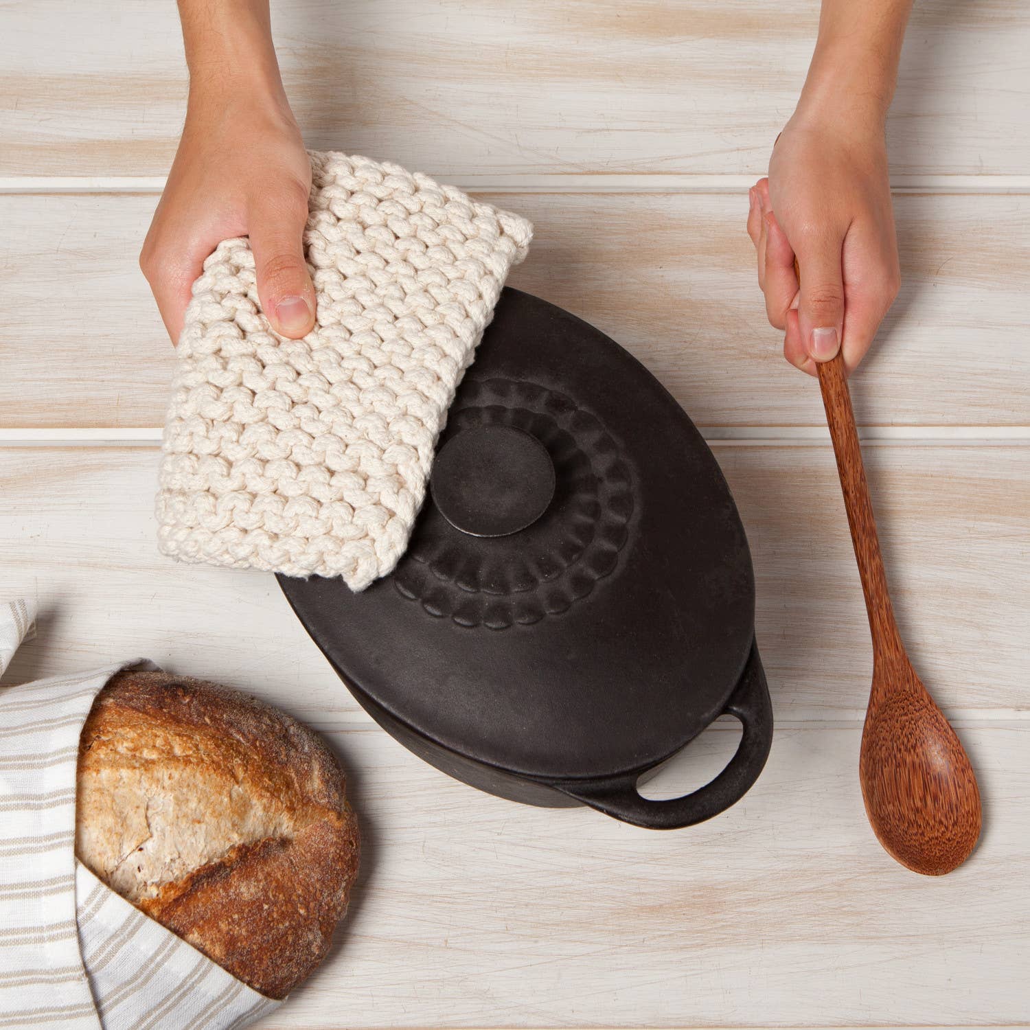 A chunky knit potholder made from 100% cotton protects hands from hot objects. Set one on the table for the perfect teapot trivet. A hanging loop makes for easy storage. Part of the Medley collection of color-coordinated kitchen and table linens from Danica Heirloom.