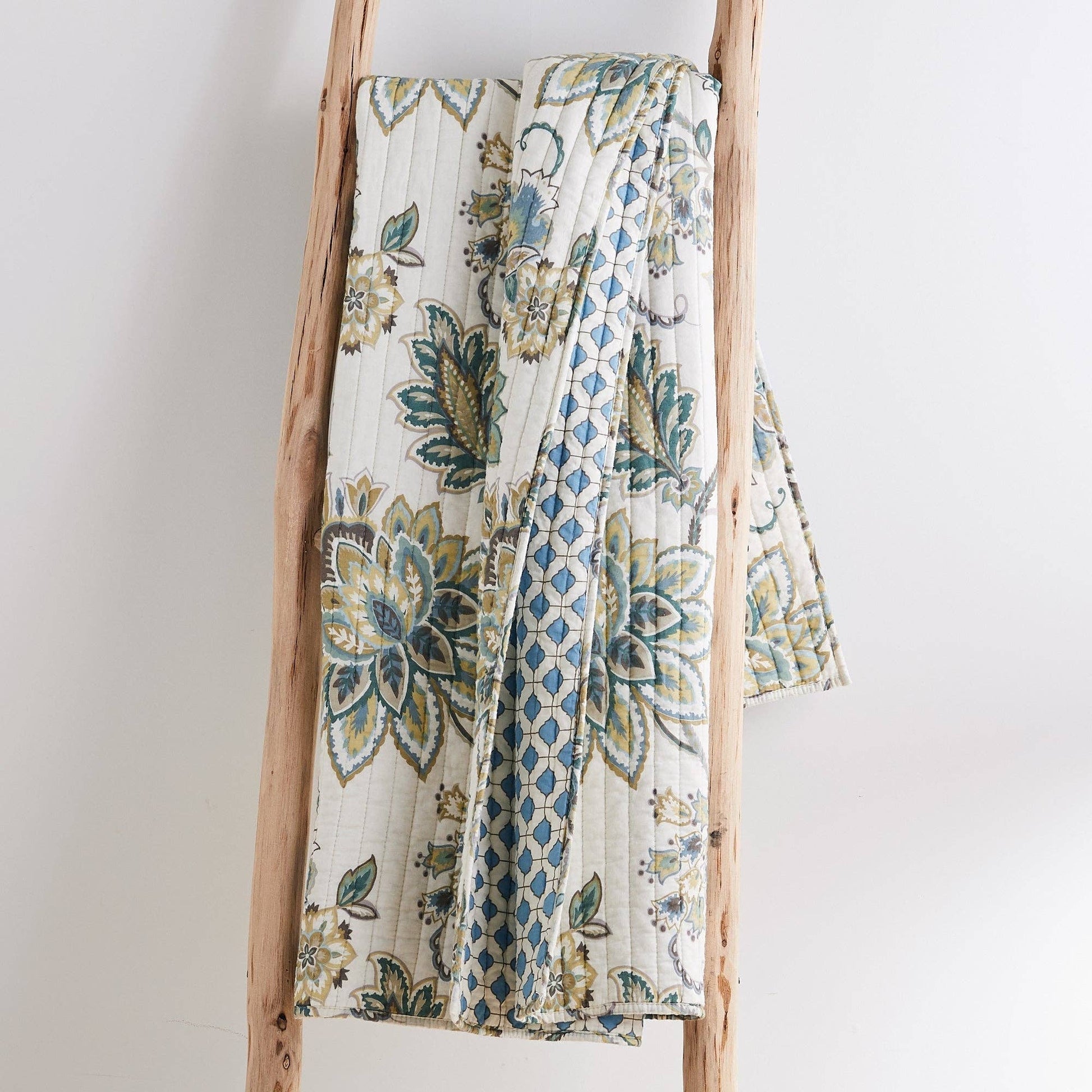 The Grey Palladium Reversible Quilted Throw blanket by Levtex Home is inspired by spring showers. This intricate Jacobean floral design will immediately transform any bedroom. Made with the softest lightweight cotton, this reversible throw features a blue and green Jacobean floral pattern on one side, reversing to a blue and white geometric pattern on the other. The Quilted Throw is perfectly sized at 50x60in. and is machine washable.