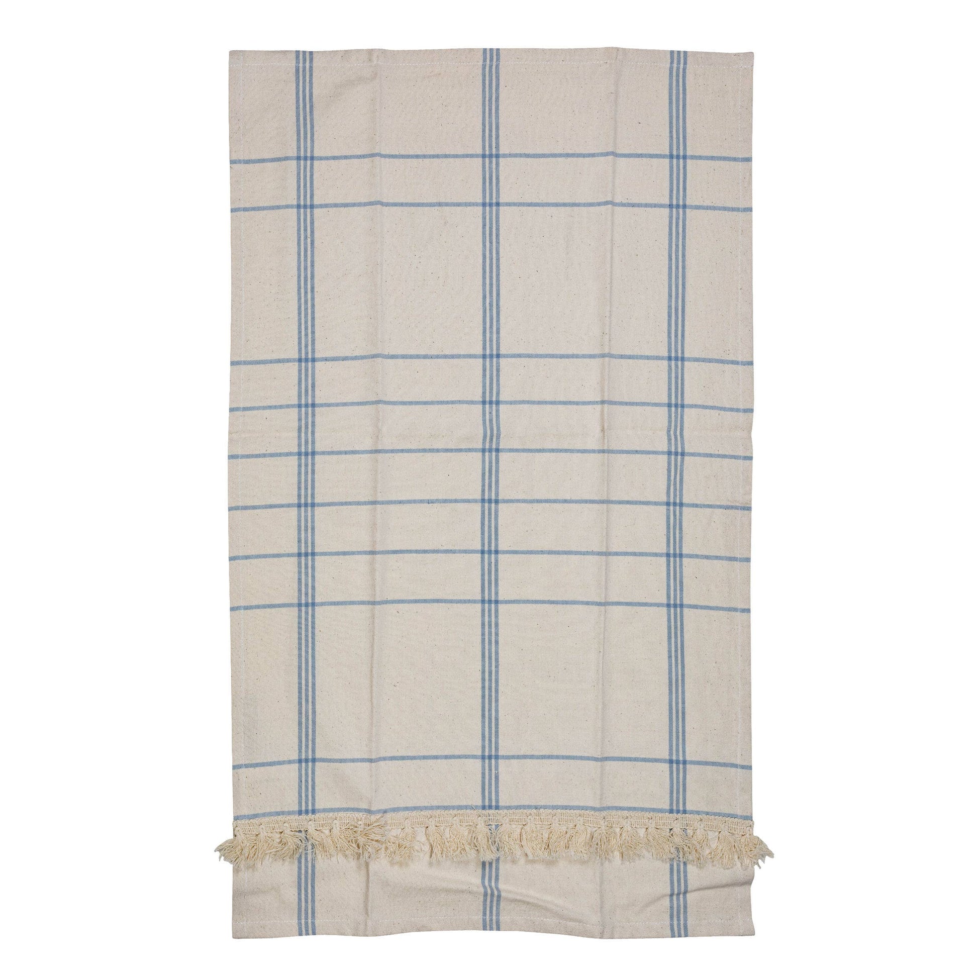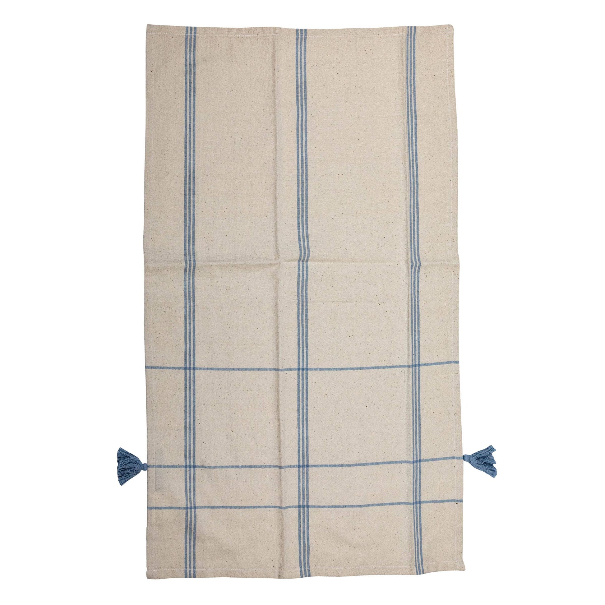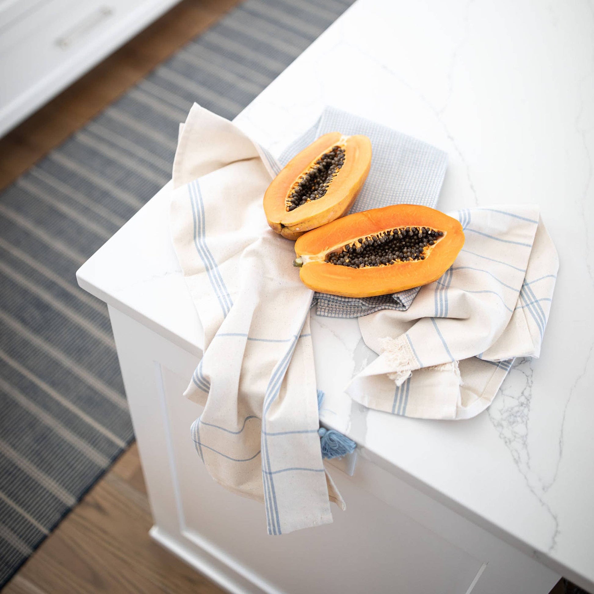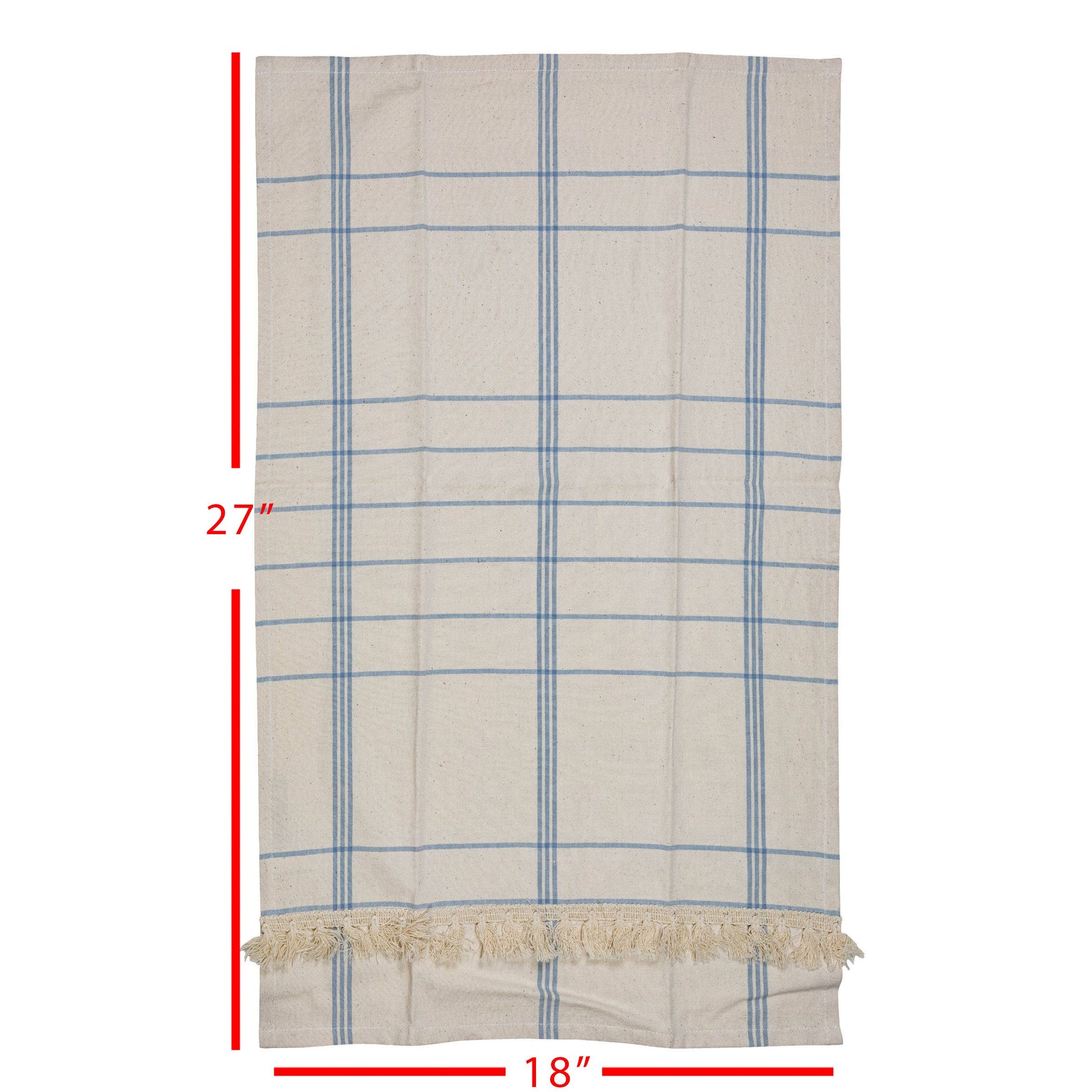 Add a touch of French country charm to your kitchen with this set of three unbleached woven tea towels. Featuring a light blue plaid design, each towel is accented with either tan fringe or hand-sewn blue tassels for a beautiful, artisanal finish. Both decorative and functional, they are crafted from waffle weave cotton and OEKO-TEX Certified for safety.