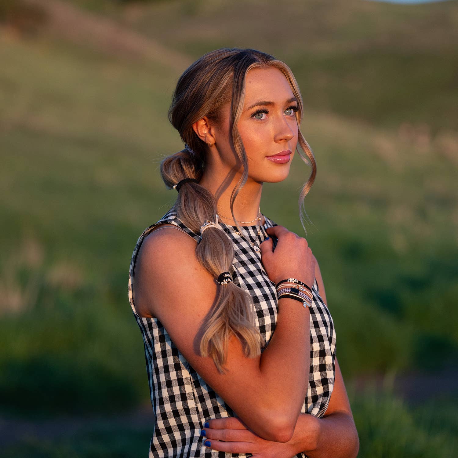 Our Unity set symbolizes connection and strength in togetherness. These 5 hair tie bracelets feature a timeless mix of black and tan tones, accented with silver and cream stone beads. A standout black and cream plaid band adds classic charm, while the gold and silver interlocking square charms represent harmony in diversity. This set is a beautiful reminder that we’re stronger when we stand united. Medium is the size of a normal hair tie band. It fits wrists between 5-6.4" around.